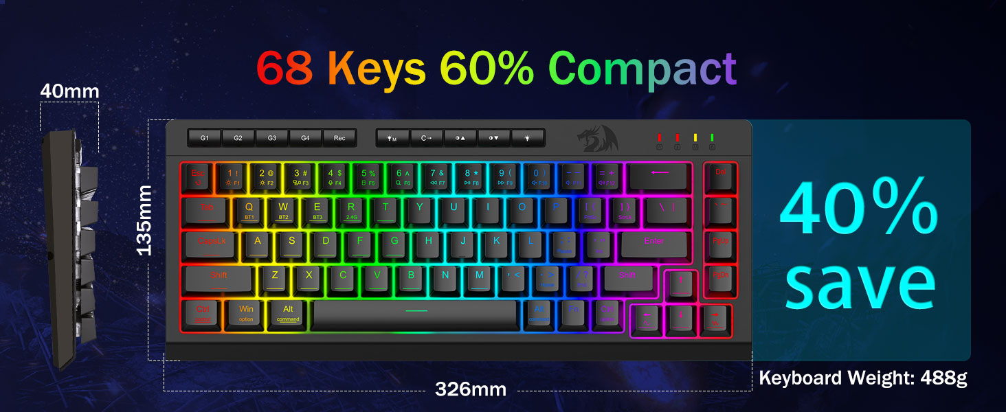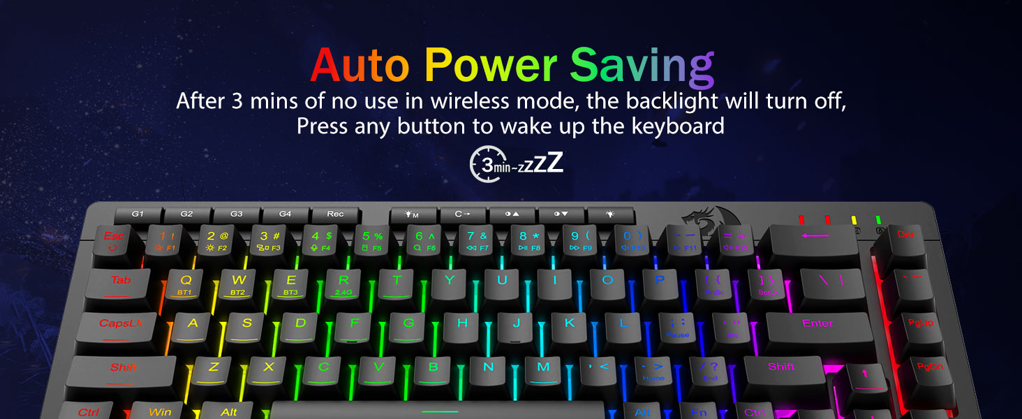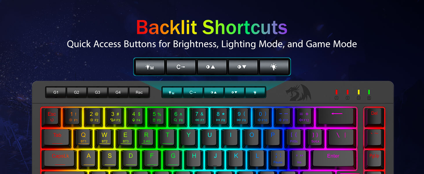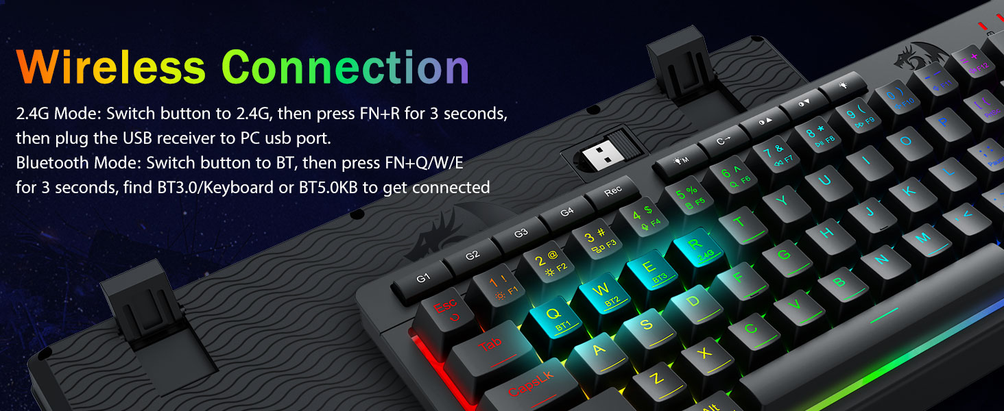 Chuangquan 社が製造する Redragon のブラック K519 Pro ポータブル ワイヤレス ゲーミング キーボードは、ゲーマーとプロフェッショナルの両方に向けたプロフェッショナル グレードのエンジニアリングを体現しています。多用途のトライモード設計は、安定した Bluetooth、低遅延 2.4GHz ワイヤレス、および USB-C 有線接続をサポートし、3 つのデバイス間で同時に簡単に切り替えることができます。キーボードには、直観的なソフトウェアを介して完全にカスタマイズできる専用のマクロ キーが含まれており、ユーザーは複雑なコマンドやショートカットを割り当てて、生産性とゲーム効率を向上させることができます。複数のエフェクトを備えたダイナミック RGB ライティングがセットアップをカスタマイズし、N キー ロールオーバーとアンチゴーストにより、激しいセッション中にすべてのキーストロークが正確に記録されます。