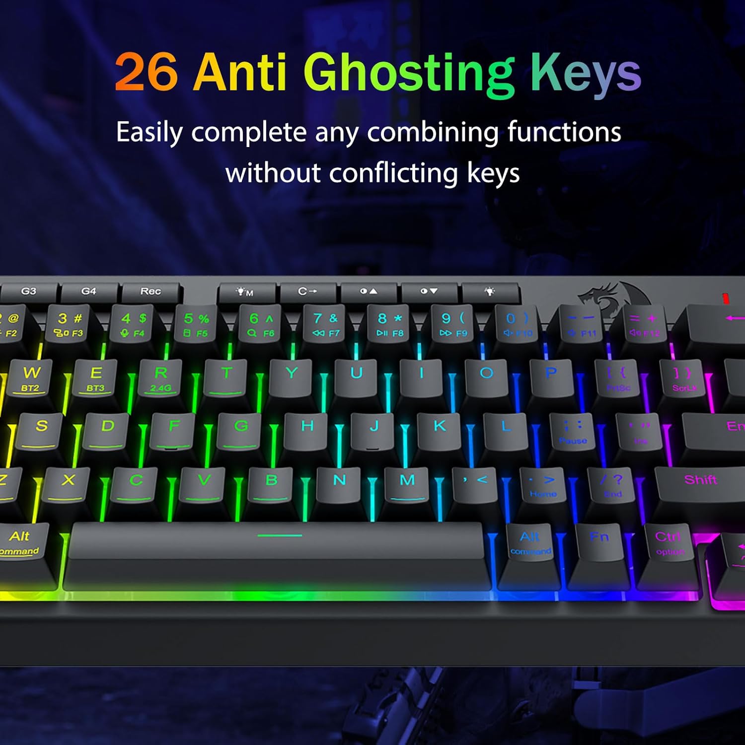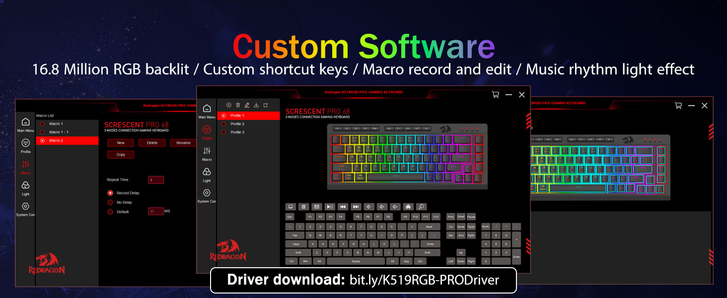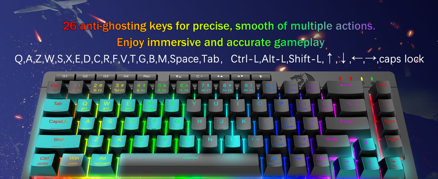 Chuangquan 社が製造する Redragon のブラック K519 Pro ポータブル ワイヤレス ゲーミング キーボードは、ゲーマーとプロフェッショナルの両方に向けたプロフェッショナル グレードのエンジニアリングを体現しています。多用途のトライモード設計は、安定した Bluetooth、低遅延 2.4GHz ワイヤレス、および USB-C 有線接続をサポートし、3 つのデバイス間で同時に簡単に切り替えることができます。キーボードには、直観的なソフトウェアを介して完全にカスタマイズできる専用のマクロ キーが含まれており、ユーザーは複雑なコマンドやショートカットを割り当てて、生産性とゲーム効率を向上させることができます。複数のエフェクトを備えたダイナミック RGB ライティングがセットアップをカスタマイズし、N キー ロールオーバーとアンチゴーストにより、激しいセッション中にすべてのキーストロークが正確に記録されます。