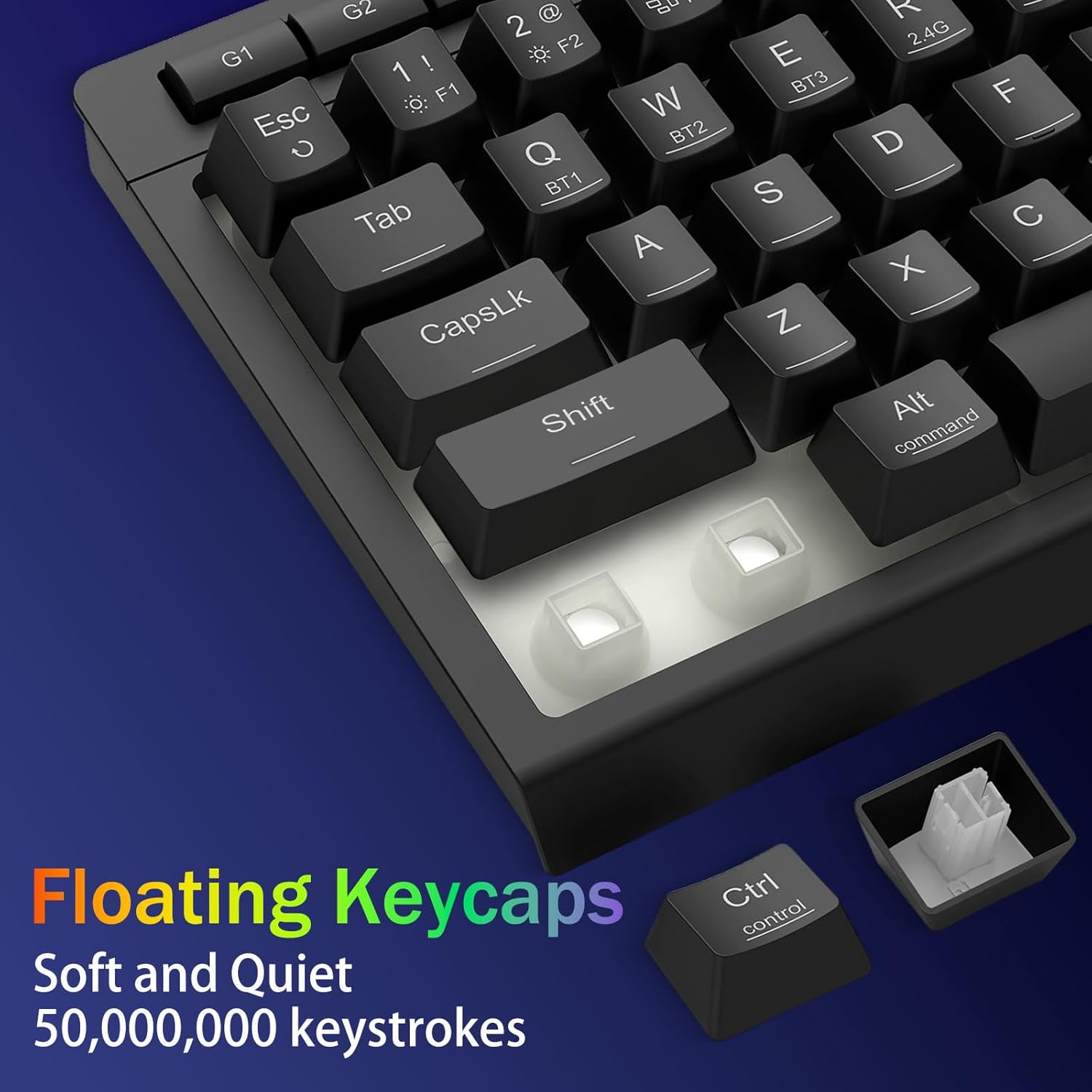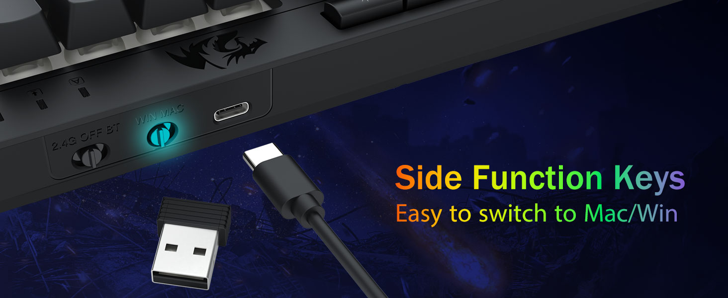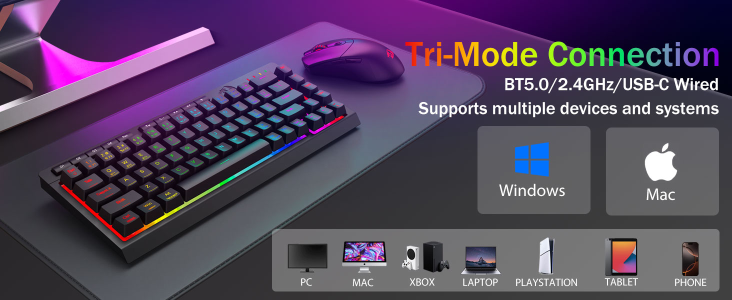 トライモードの多用途性とマルチデバイスの習熟 -Bluetooth 5.0、2.4GHz ワイヤレス、または USB-C 有線モードをシームレスに切り替え、最大 5 台のデバイス (PC、Mac、タブレット、電話、PS/XBOX) を同時に接続できます。ショートカット キーまたはサイド ボタンを使用してデバイスを簡単に切り替えられるため、仕事とゲームのハイブリッド セットアップに最適です。 4,000mAh バッテリーで数週間電力を供給し続けます (スタンバイ 30 日以上、RGB ランタイム 50 時間)。
