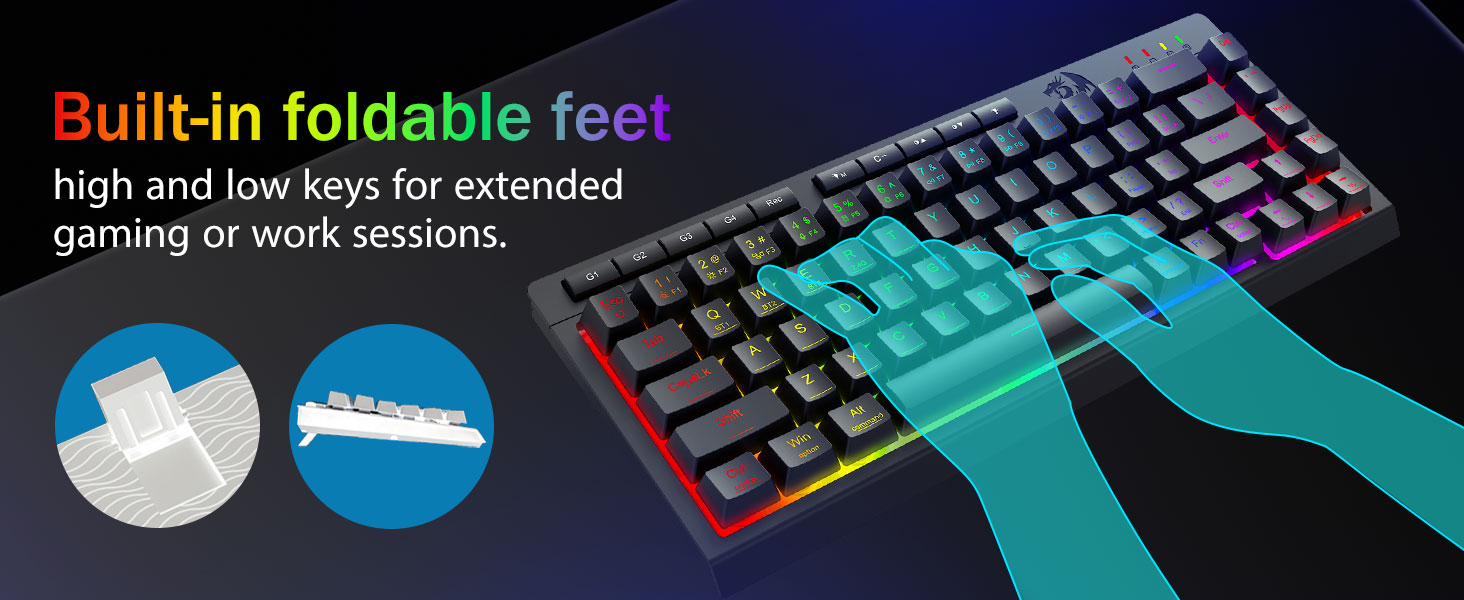 没入型 RGB ライティングとカスタマイズ可能な雰囲気 -8 つのプリセット モード (レインボー ウェーブ、リアクティブ タイピング) + 6 つの DIY プロファイルで 1,680 万の RGB カラーを解き放ちます。鮮やかな輝きからステルス モードまで明るさを調整でき、深夜のゲームやオフィスでの使用に最適です。