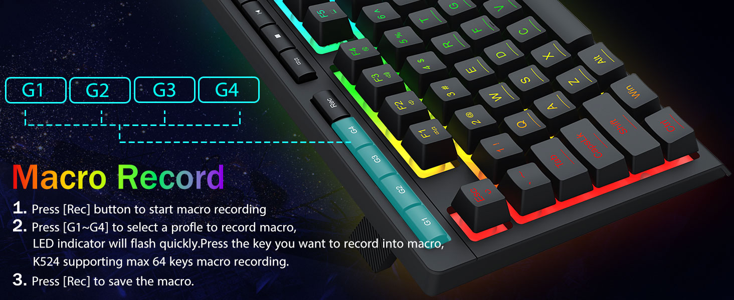 ソフトウェアサポート -利用可能なソフトウェアを使用してオプションを拡張し、独自の新しいモードやエフェクトを設計します。より効率的な仕事やゲームのための、さまざまなキーバインドまたはショートカットを備えたマクロ。ソフトウェアリンク: bit.ly/K524WiredDriver