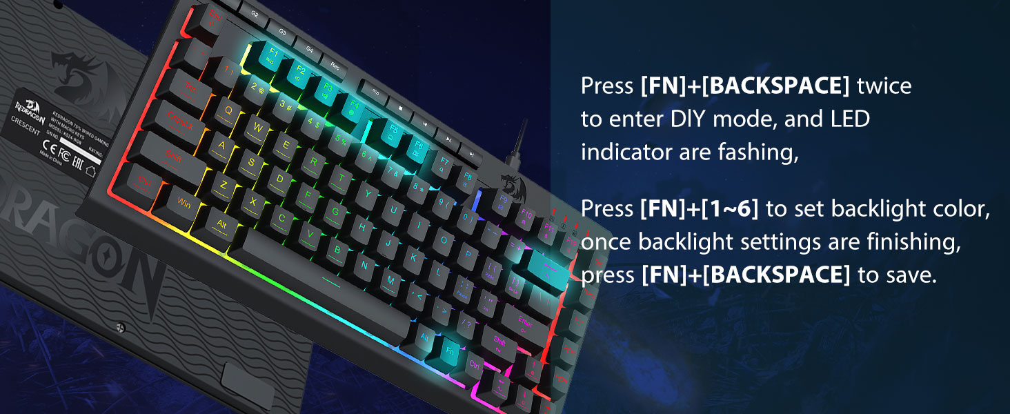True RGB バックライト -フルダイナミック RGB バックライトにより、想像力だけで無限の照明の可能性が可能になります。キーボードには 8 つのプリセット照明モードと、カスタマイズ可能なモード用の追加の 6 つのスロットが付属しています。このボードでは、非常に明るいものから照明が必要ない場合は完全に消灯するものまで、明るさを制御することもできます。