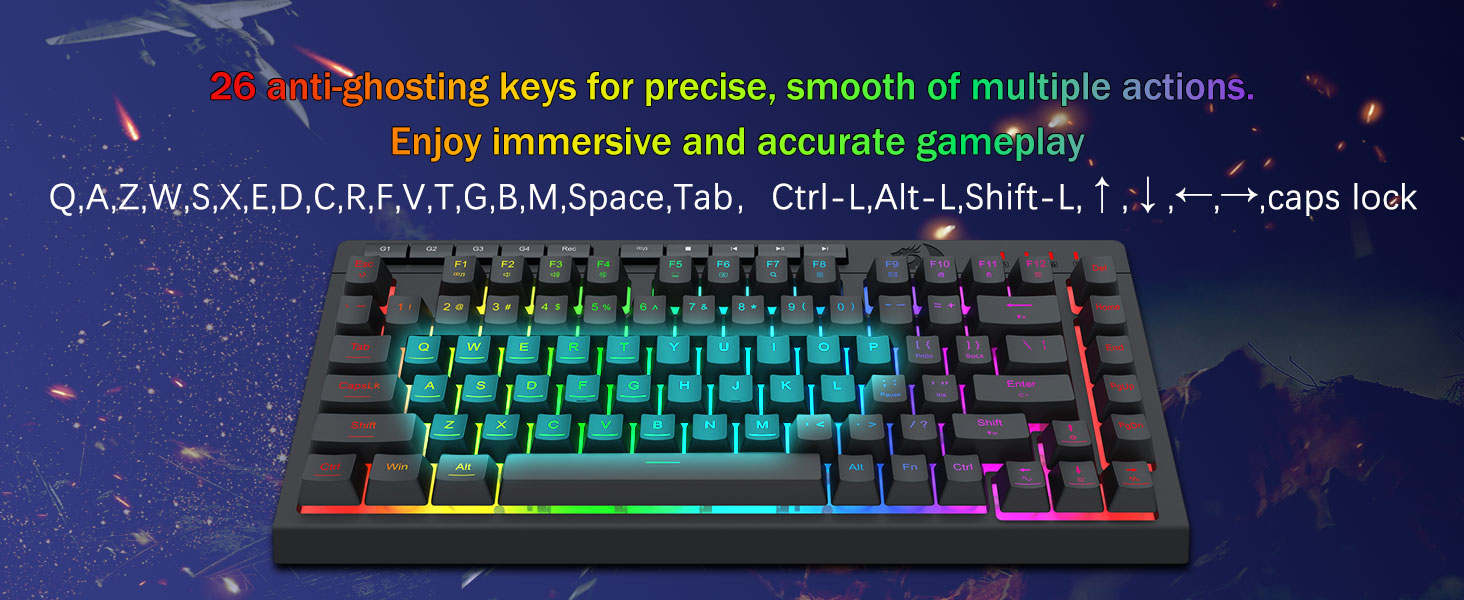 26 個のアンチゴースト キーと専用メディア コントロール -アンチゴースト キー (アンダースコア付きのキー) を備えており、26 個のキーが同時に動作し、意図したとおりに高速かつ正確なゲーム応答を実現します。専用のメディア コントロールを使用すると、キーボードから直接マルチメディアの再生、一時停止、スキップができるため、ゲームプレイがスムーズで中断されません。