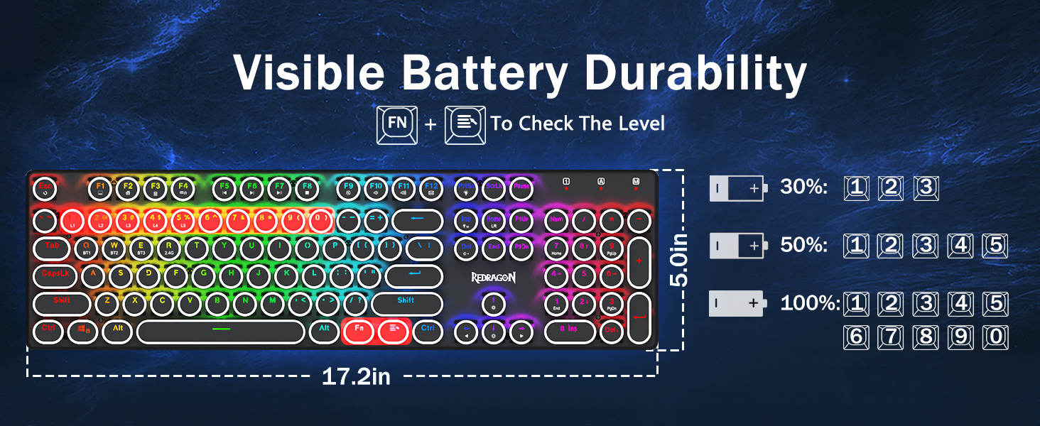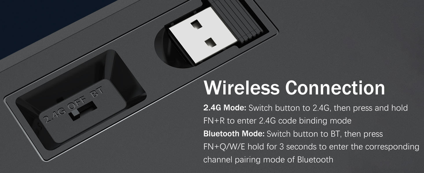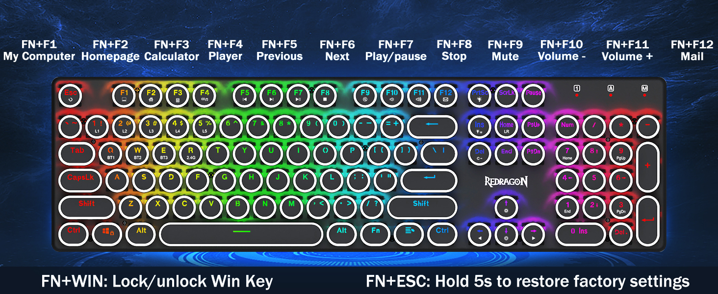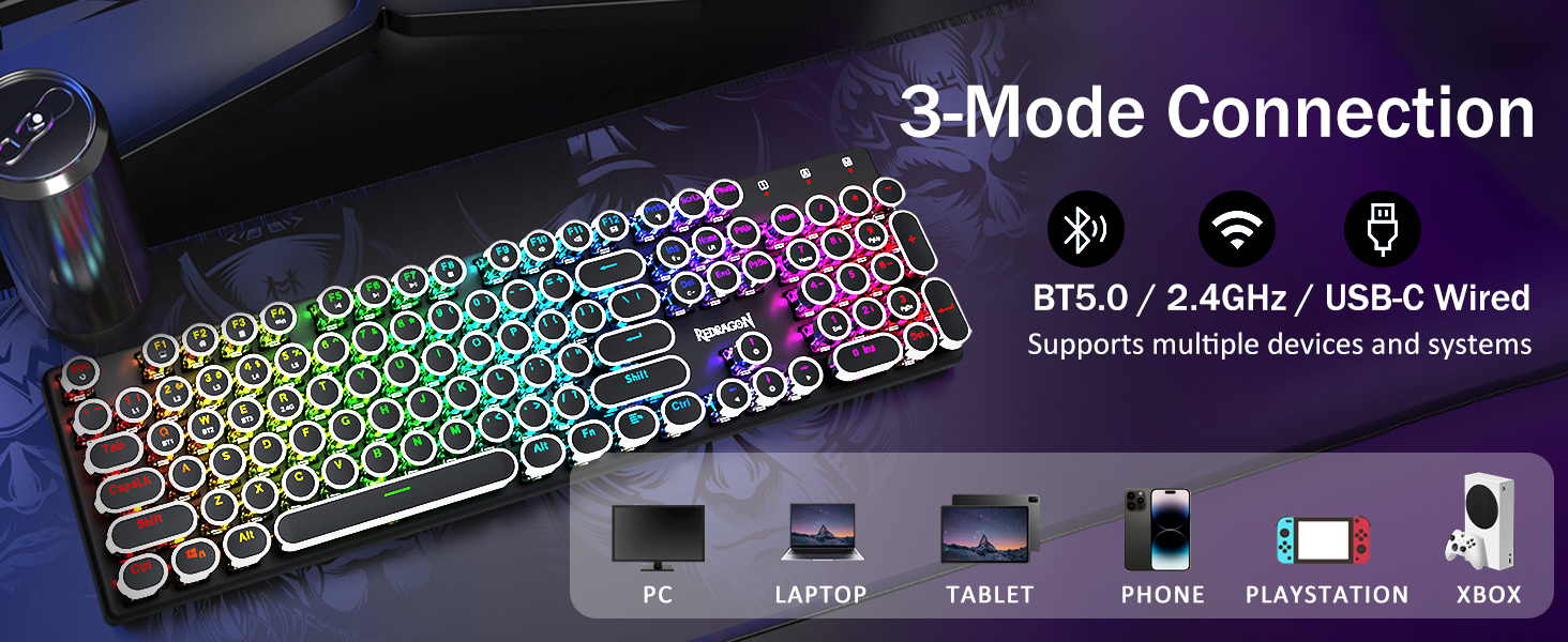 𝟯-𝗠𝗼𝗱𝗲 𝗖𝗼𝗻𝗻𝗲𝗰𝘁𝗶𝗼𝗻 -Redragon の革新的なトライモード接続テクノロジー、USB-C 有線、Bluetooth 5.0/3.0 & 2.4Ghz 無線モードを搭載し、あらゆる分野でユーザー エクスペリエンスを別のレベルにアップグレードします。 FN+Q/W/E を押して Bluetooth モードに、FN+R を押して 2.4G モードにします。