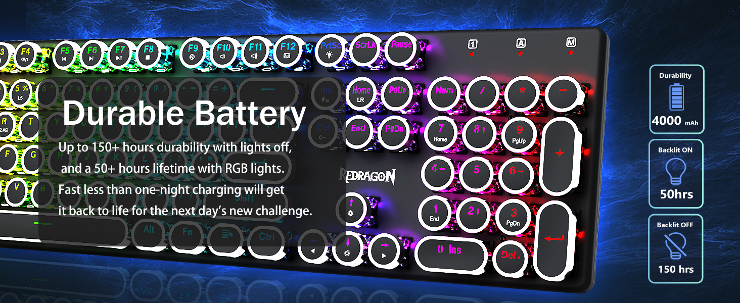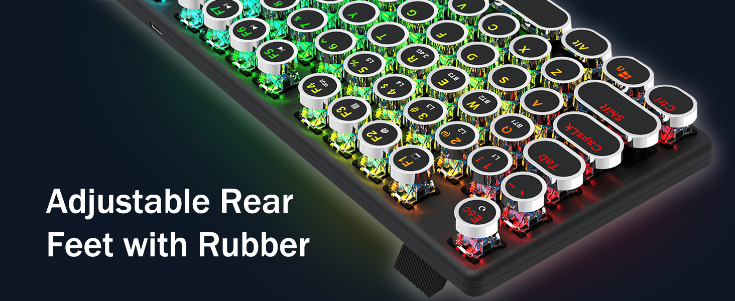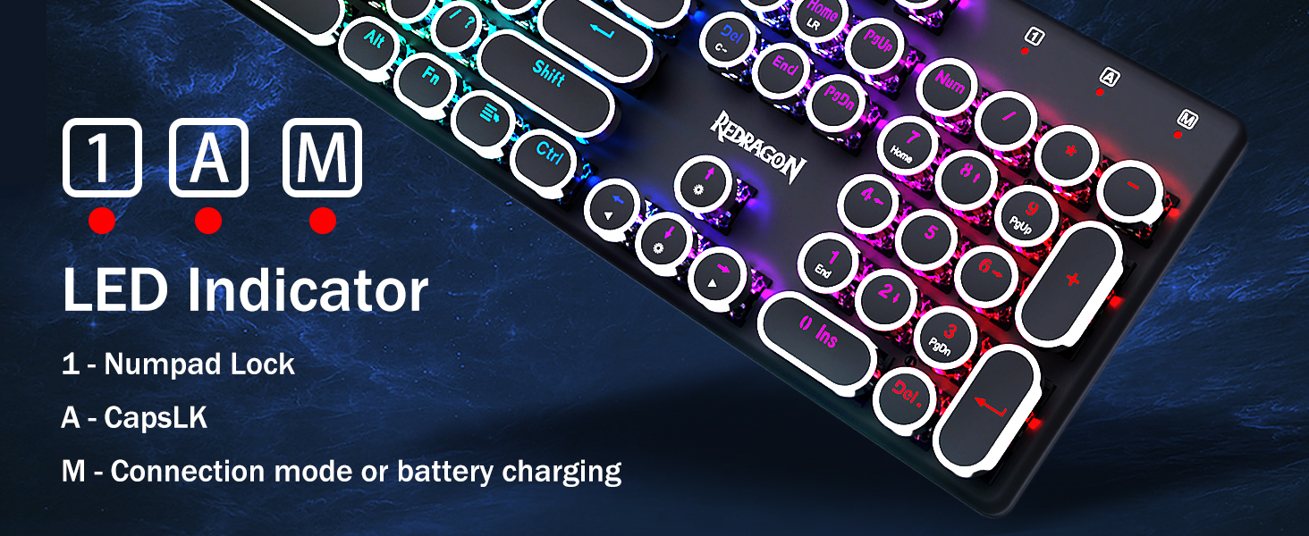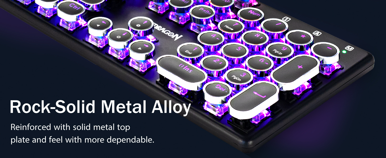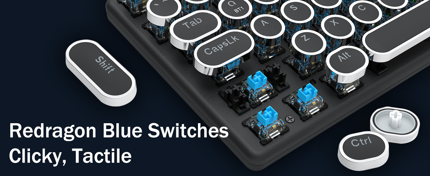𝗥𝗲𝘁𝗿𝗼𝗧𝘆𝗽𝗲𝘄𝗿𝗶𝘁𝗲𝗿 𝗠𝗲𝗰𝗵𝗮𝗻𝗶𝗰𝗮𝗹 𝗞𝗲𝘆𝘀 -Redragon メカニカルブルースイッチは、中程度の抵抗、可聴のクリックカチャカチャ音と触覚フィードバックを提供し、応答性が高く正確なゲーム環境とパフォーマンスを提供します。ビンテージのスチームパンク キーボードの丸いキーキャップはクラシックなタイプライターのように見え、快適なタイピング感と安定したクリック感をもたらします。