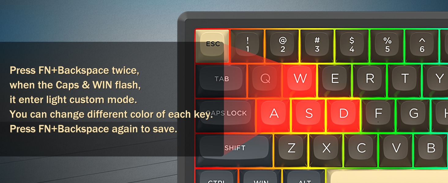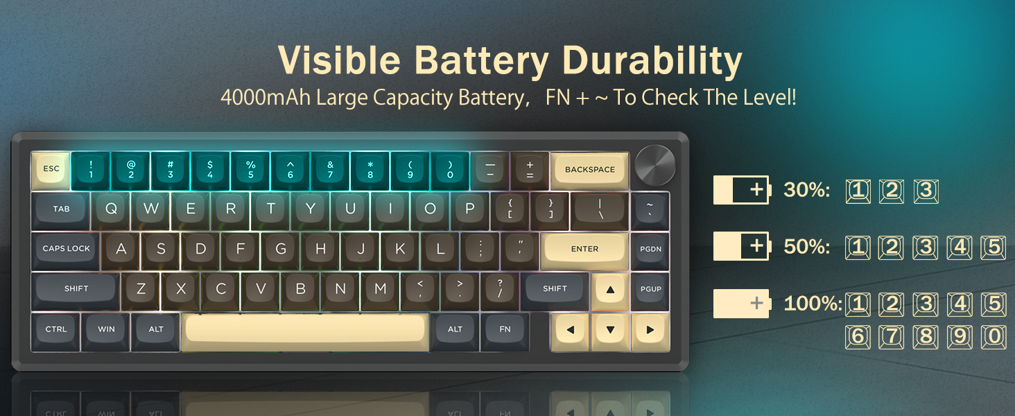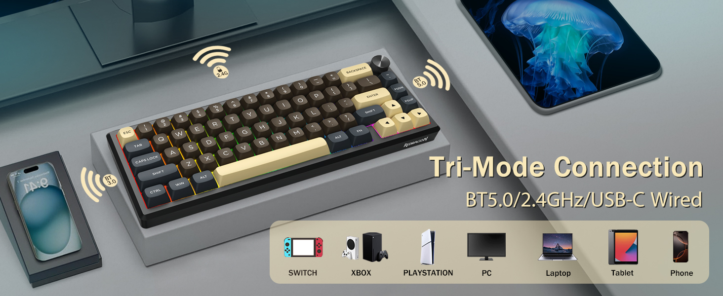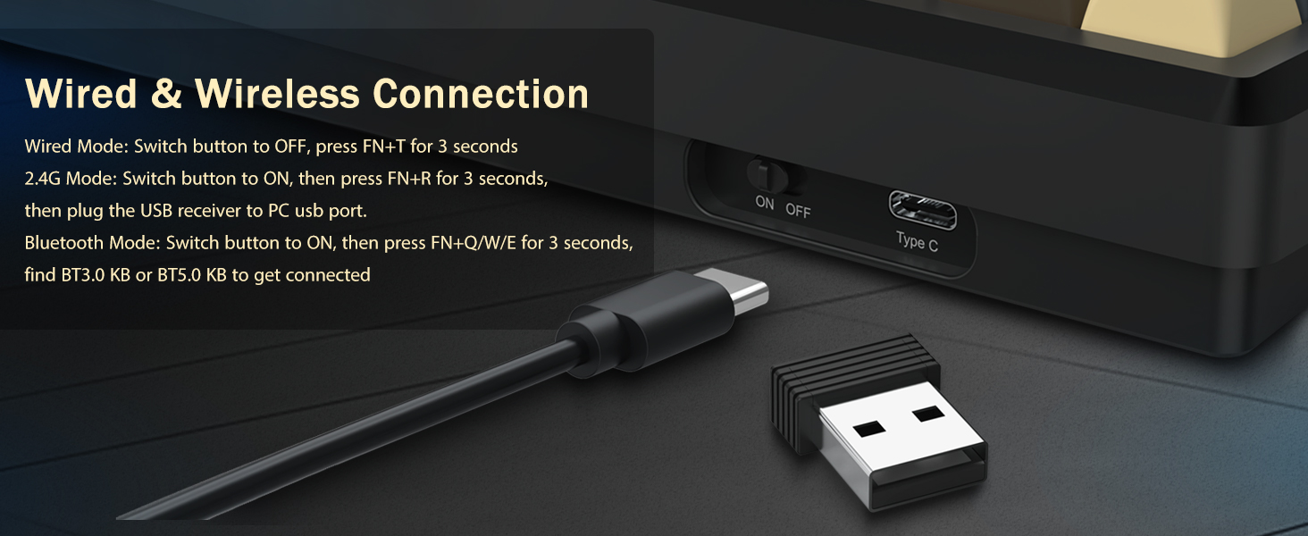 キーボードは利便性を高めるワイヤレス接続と、安定したパフォーマンスを実現する有線 USB 接続をサポートしています。ユーザーは設定に応じてモードを切り替えることができます。