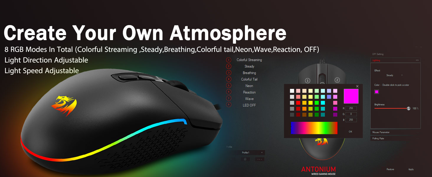 8 つの適切な RGB バックライト モード- バックライトをオンにして、ゲームの戦場でキルを達成しましょう。誇大宣伝されたダイナミックな RGB バックライト付きの雰囲気は、ゲーム スペースを飾るときに決して失望させることはありません。ライトをオンにした他の Redragon アクセサリと組み合わせるとさらに良くなります。