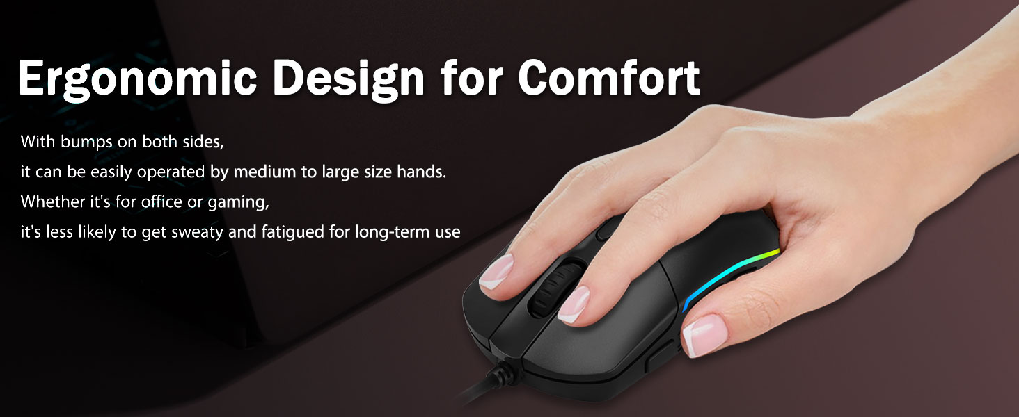 コンフォートグリップ- 両側の人間工学に基づいたバンプにより、ゲーミング マウスはどんな手にもフィットします。長時間の激しいゲームプレイでも疲れることなく、プレイヤーに長時間快適な履き心地を提供します。ゲーミングマウスを持ち上げたり、高速かつ正確にスワイプしたりしても滑りません。