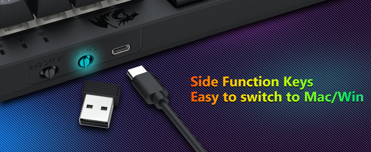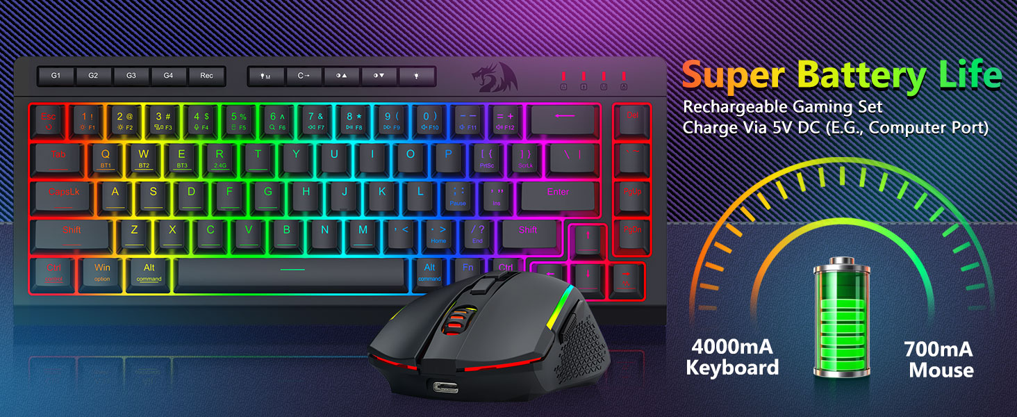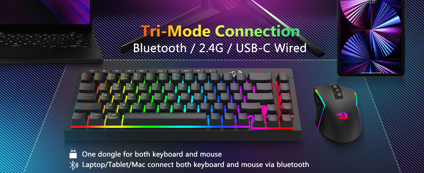 トライモードの多用途キーボードとマウス- Bluetooth 5.0、2.4GHz ワイヤレス、または USB-C 有線モードをシームレスに切り替えて、さまざまなデバイス (PC、Mac、タブレット、電話、PS/XBOX) に接続します。ショートカット キーまたはサイド ボタンを使用してデバイスを簡単に切り替えられるため、仕事とゲームのハイブリッド セットアップに最適です。 4,000mAh バッテリー キーボードと 700mAh バッテリー マウスを使用すると、数週間電力を供給できます (スタンバイ 30 日以上、RGB ランタイム 50 時間)。