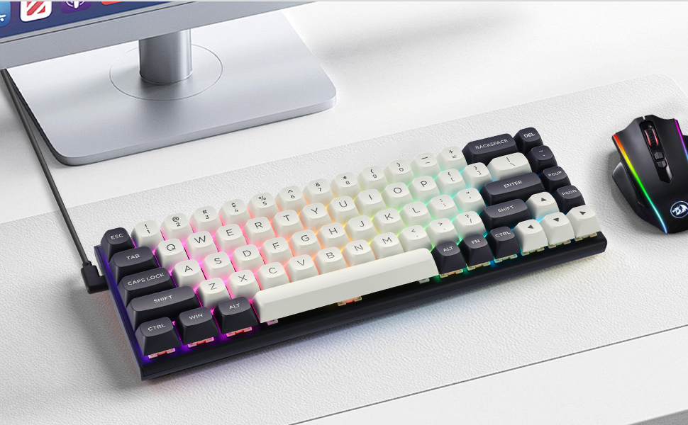 キーボードは、ゲーム環境とプロフェッショナル環境の両方に適した、すっきりとした白または青黒の配色のミニマルなデザインを採用しています。コンパクトな構造により、ユーザーはより整理されたワークスペースを維持できます。