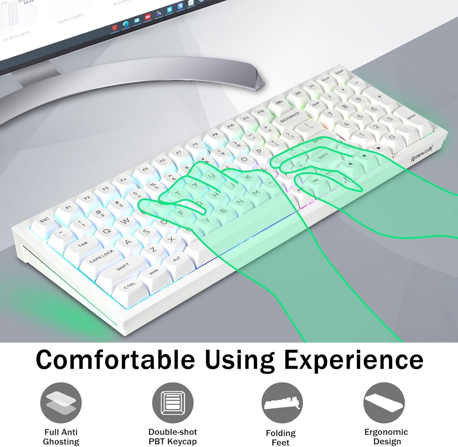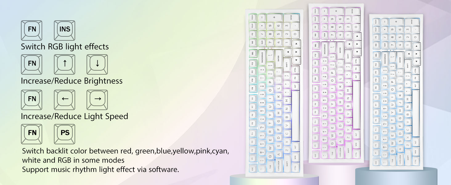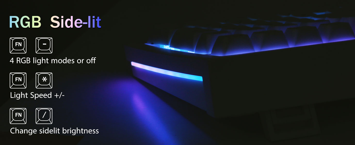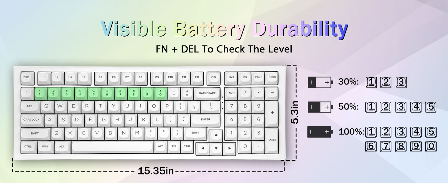 PBT キーキャップと 4000mAh バッテリー:99 キー 96% レイアウトのコンパクト キーボードは、ゲームや仕事に必要な矢印キーと数字領域を維持しながら、デスクトップのスペースをさらに節約できます。充電式キーボードには4000mAhの大容量バッテリーが内蔵されており、より多くの電力とより長いバッテリー寿命を提供します。ダブルショット PBT キーキャップは、2 色の素材を相互に成形して作られており、キーキャップの文字が鮮やかさと彩度を維持し、鮮明で色あせません。