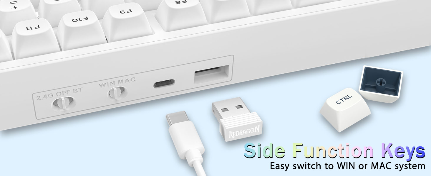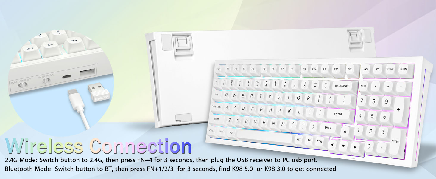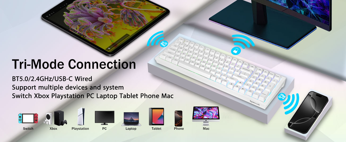 マルチデバイス接続:Redragon K723 ワイヤレス メカニカル キーボードは、BT5.0、2.4GHz ワイヤレス モード、USB 有線モードを含む 3 つの接続方法を提供します。最大 5 台のデバイスに同時に接続でき、FN とキーの組み合わせキーで簡単に切り替えることができます。仕事、ゲーム、勉強のニーズを満たすためにキーボード接続に制限はありません。