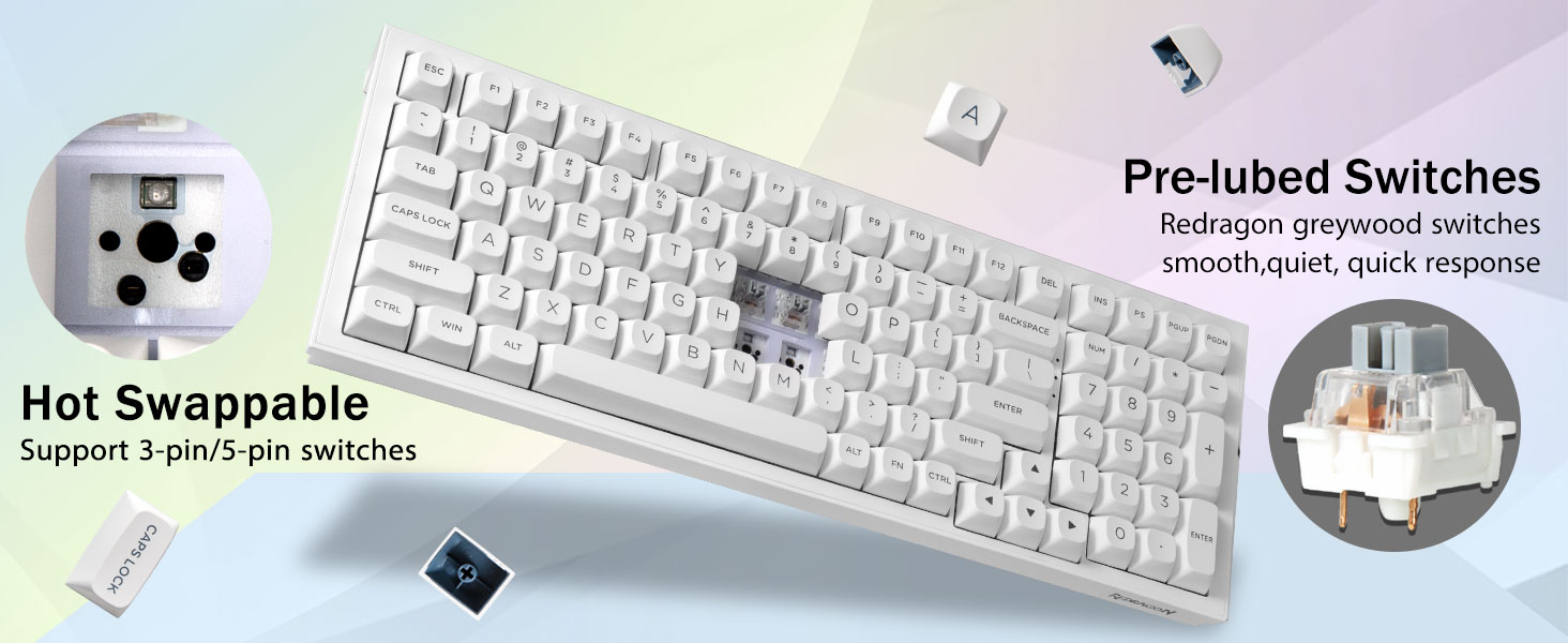 ホットスワップ可能なカスタム キーボード:スイッチとキーキャップは自由に交換できます (キーキャップ/スイッチプーラーはパッケージに含まれています)。ホットスワップ PCB を備えたこのカスタマイズ可能なキーボードを使用すると、はんだ付けの問題なく 3 ピン/5 ピンのスイッチを簡単に交換できます。 K723 メカニカル キーボードは潤滑済みリニア スイッチを備えており、スムーズなタイピング感と快適なタイピング音をもたらし、エキサイティングなゲームのための高速応答を提供します。