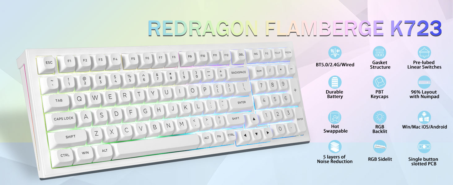 中国の業界をリードするメーカーである Chuangquan は、競争力のあるゲームを再定義するために Redragon ホワイト クリーミー K723 ワイヤレス メカニカル ゲーミング キーボードを設計しました。この強力な製品は、5 つのデバイス間でシームレスな切り替えを実現するトライモード接続 (Bluetooth/2.4GHz/USB-C) を備え、そのガスケット構造と PCB のシングルキースロットによりノイズが除去され、触覚フィードバックが強化されます。潤滑済みのメカニカル スイッチは、クリーミーで応答性の高い感触を提供し、ホットスワップ可能な設計により、3 ピンまたは 5 ピンのスイッチを簡単にカスタマイズできます。色褪せしにくいダブルショット PBT キーキャップにより、耐久性とスタイルが融合し、4000mAh バッテリーにより、鮮やかな RGB バックライトで長時間のゲーム セッションが可能になります。 Chuangquan は大量調達に最適で、厳格な品質管理と柔軟な OEM オプションを提供し、すべてのユニットがエリート基準を満たしていることを保証します。革新性と信頼性を兼ね備えた Chuangquan と提携して、e スポーツと日常使用の両方で優位に立つキーボードを顧客に提供しましょう。