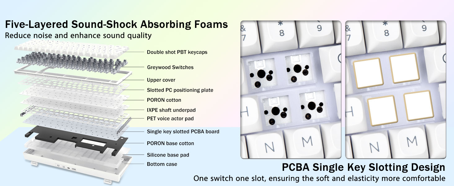 ガスケット構造と PCB シングルキースロット:このコンピュータキーボードは、ガスケット構造、拡張統合シリコンパッド、PCBシングルキースロットを備えており、弾力性と安定性がより最適化され、手の感触がより柔らかく弾力性があります。 5層の充填サイレンサーがPCB、位置決めプレートとシャフトの間の隙間を埋め、シャフトが位置決めプレートに当たるキャビティノイズ音を効果的に抑制し、しっかりとした感触を提供します。