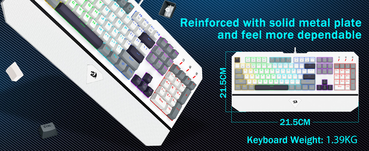 【ハイエンド104鍵フルサイズキーボード】キーボードパネルは最高級の金属合金と ABS 素材で作られており、非常に頑丈で傷がつきにくいです。金メッキの USB コネクタは、安定した信頼性の高い接続を保証し、究極のゲーム パフォーマンスを実現します。重さ 1.39kg のこのキーボードは、手に持つと固体タンクのように感じられ、使用中に比類のない安定性を提供します。
