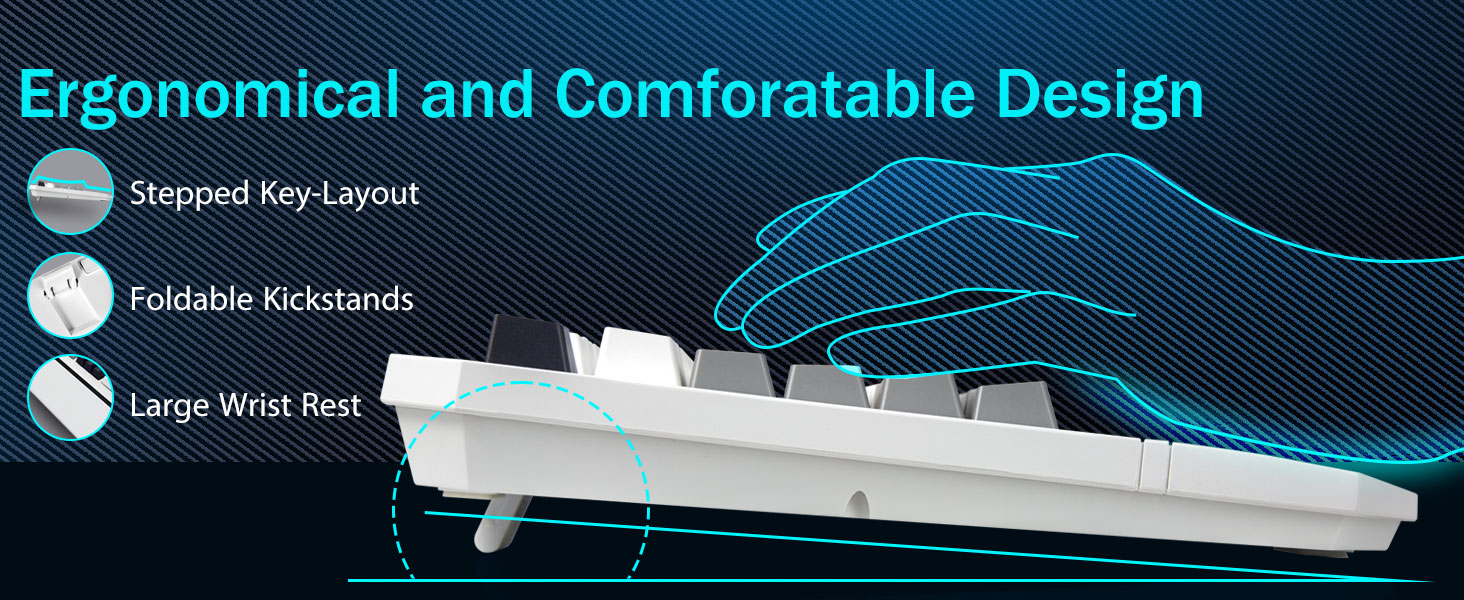 【先進の人間工学により一日中快適】快適さを念頭に置いて設計された当社の PC ゲーマー キーボードは、科学的な階段状のキーキャップ レイアウトと広々としたリスト レストを備えています。この設定により腕が自然な位置に保たれるため、長時間使用しても手の疲労が軽減されます。有線キーボードには 2 つの頑丈な折りたたみ式背面キックスタンドも付属しており、最適な姿勢になるように傾きを調整できます。